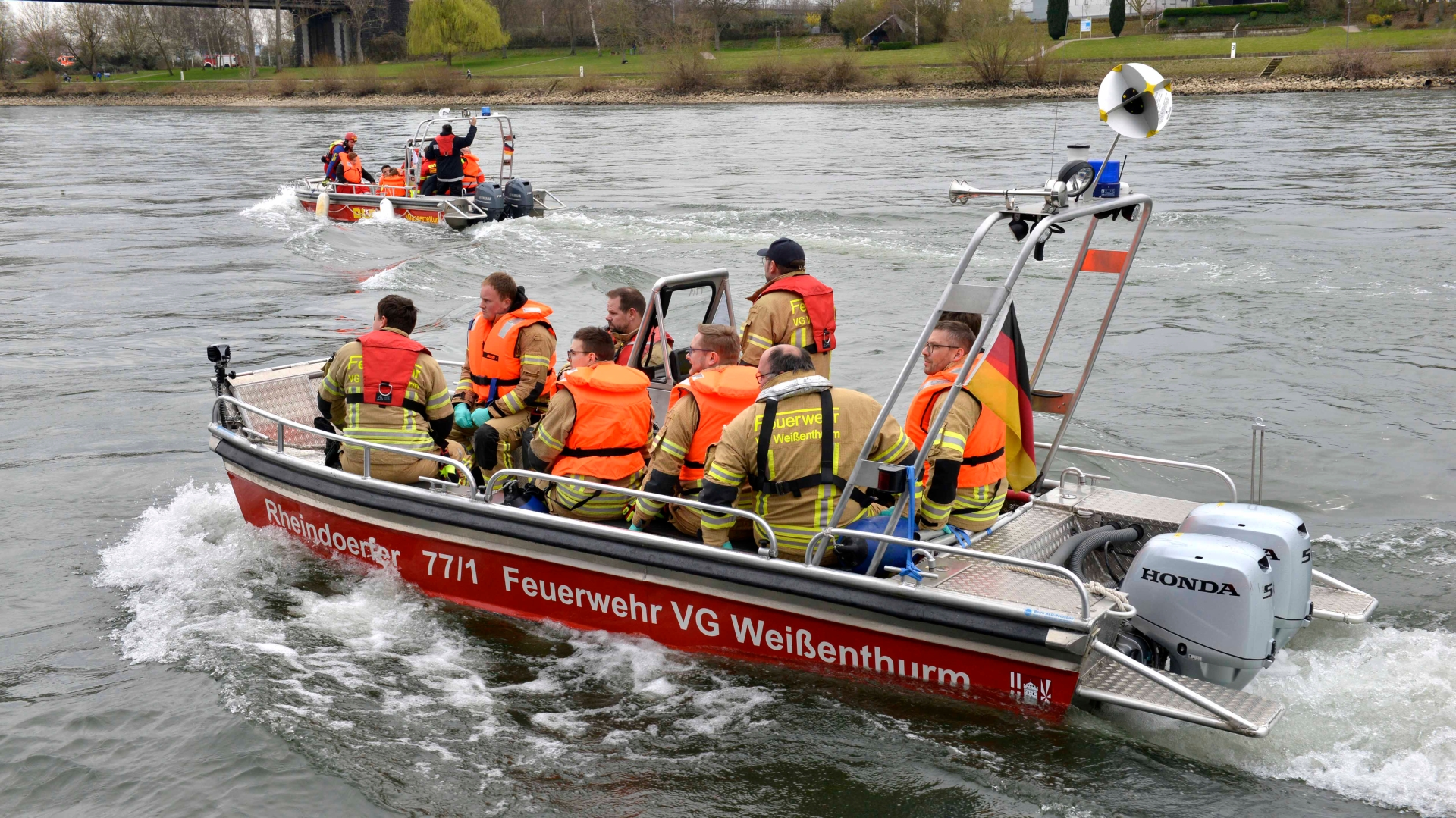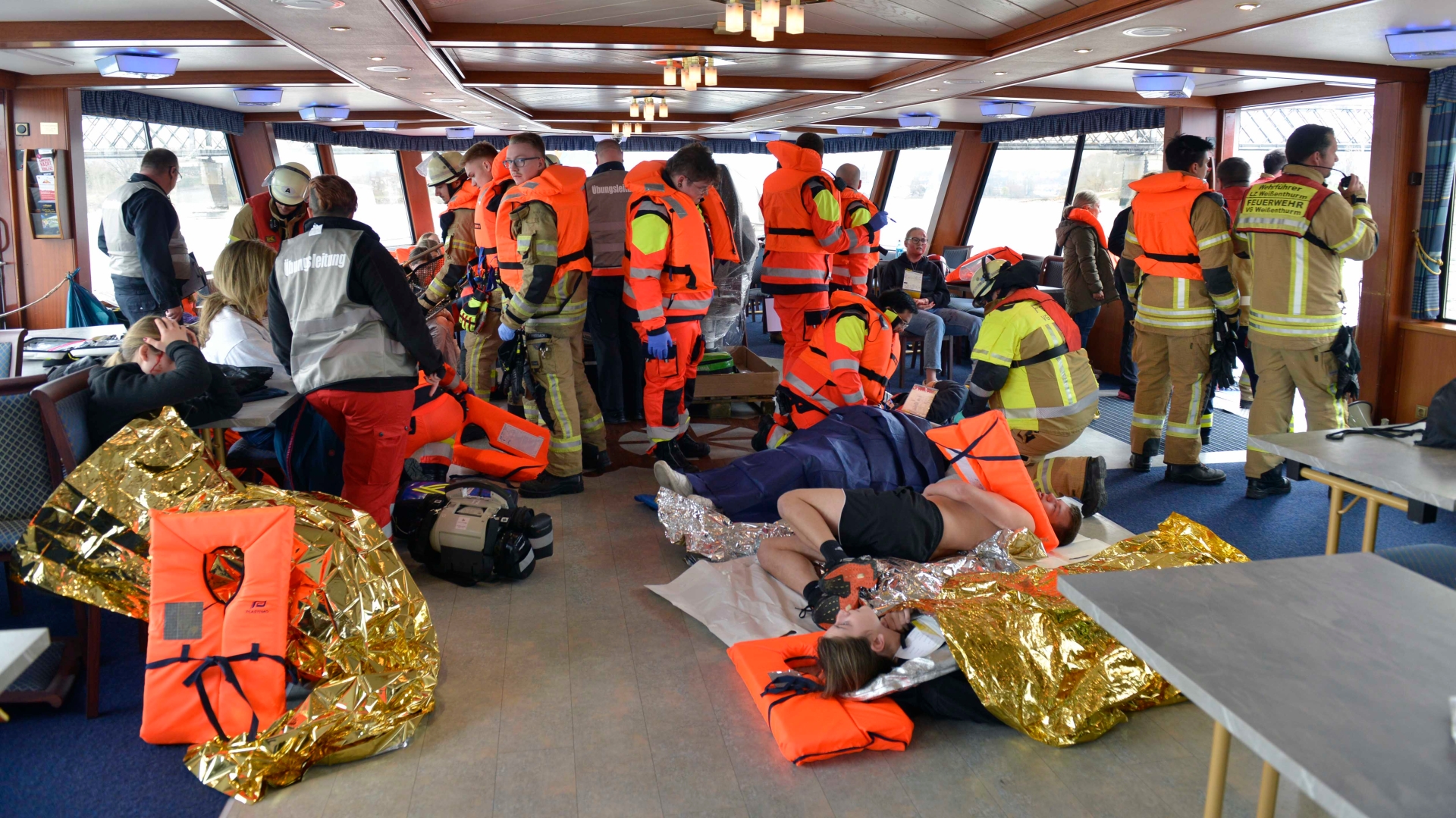 Ein Fahrgastschiff ist mit der Kronprinz-Wilhelm-Brücke in Urmitz kollidiert. Nach dem Aufprall auf die Eisenbahnbrücke ist das Schiff manövrierunfähig, allerdings gelingt dem Schiffsführer Richtung Urmitzer Werth ein Notankermanöver. Bei der Kollision zogen sich 27 Personen Verletzungen mit unterschiedlichem Schweregrad zu. Mit diesem Szenario setzten sich die Feuerwehreinheiten der VG mit dem DRK-Kreisverband Mayen-Koblenz, dessen Rettungsdienst Rhein-Mosel Eifel, der DLRG Andernach und Ahrweiler, dem Wasserstraßen- und Schifffahrtsamtes (WSA) Rhein sowie mit Polizei und Wasserschutzpolizei Andernach auseinander. Insgesamt waren rund 220 Personen an der Großübung ‚“Undine“ beteiligt, die nach dem mythologischen, weiblichen Wassergeist aus einer oberrheinischen Sage benannt war. Die Übungsleitung hatten der stellvertretende Wehrleiter Marco Ihrlich und der Wehrführer der Weißenthurmer Feuerwehreinheit, Torsten Schnack, übernommen. „Ziel war es, die Zusammenarbeit zwischen der Einsatzleitung der Feuerwehr, den anderen Organisationen mit Sicherheitsaufgaben, des WSA und der Polizei zu trainieren“, erklärte Ihrlich. Zudem sollten interne Abläufe überprüft und die Absprachen mit der Berufsschifffahrt und der Wasserschutzpolizei eingeübt werden. Entsprechend des Szenarios mussten nach der fiktiven Kollision des Schiffs mit der Brücke zunächst Feuerwehrpersonal und Rettungsdienst auf den Havaristen transportiert werden, wo die Hilfskräfte die Verletzten sichteten und versorgten. Rund 30 sogenannte Mimen, darunter viele Kinder und Jugendliche, hatten von DLRG-Angehörigen ganz verschiedene Verletzungen per Schminke aufgetragen bekommen.