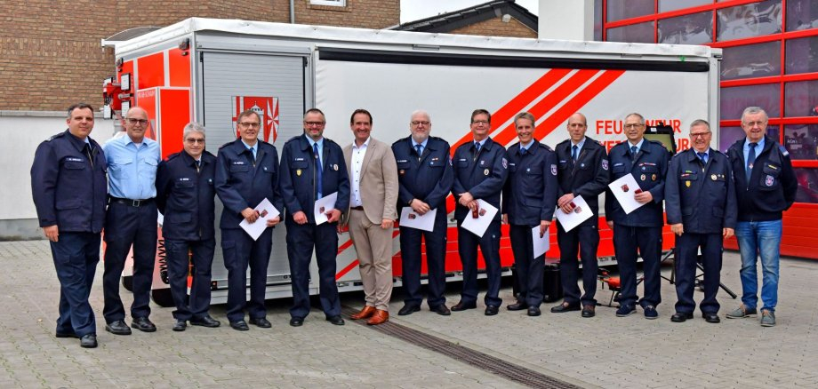 Besondere Anerkennung erhielten bei dem Treffen auch in diesem Jahr wieder Kameradinnen und Kameraden, die sich über viele Jahre hinweg mit außergewöhnlichem Engagement in den Dienst der Feuerwehr gestellt haben. Da Landrat Marko Boos verhindert war, übernahm VG-Bürgermeister Thomas Przybylla die Auszeichnungen. Für 45 Jahre aktive, pflichttreue Tätigkeit bei der Feuerwehr erhielt Hauptbrandmeister Jörg Börner von der Einheit Rheindörfer das Goldene Ehrenzeichen. Dieselbe Auszeichnung für 35 Jahre aktiven Dienst erhielten die Löschmeister Thomas Diener von der Einheit Mülheim-Kärlich, Manfred Höfer und Holger Klemens von der Einheit Urmitz sowie die Brandmeister Jörg Oster und Dirk Schoor, ebenfalls von der Einheit Urmitz mit Hauptbrandmeister Michael Zimmer von der Einheit Rheindörfer. Oberfeuerwehrmann Michael Söhn aus der Einheit Rheindörfer wurde nach langjährigem Feuerwehrdienst in die Alters- und Ehrenabteilung verabschiedet. Das 60. Lebensjahr vollendet hat auch Oberbrandmeister Helmut Görges von der Einheit Kettig, dessen Ehrung nachgeholt wird. Gleiches gilt für Wilfried Neckenig, der bei dem Treffen ebenfalls nicht dabei sein konnte. „Ich danke herzlich allen Geehrten, die über Jahrzehnte hinweg im Dienst der Allgemeinheit standen“, sagte Przybylla. Sein besonderer Dank galt zudem der Feuerwehr Weißenthurm für die hervorragende Organisation und Bewirtung, die das gelungene Treffen ermöglicht hatte.