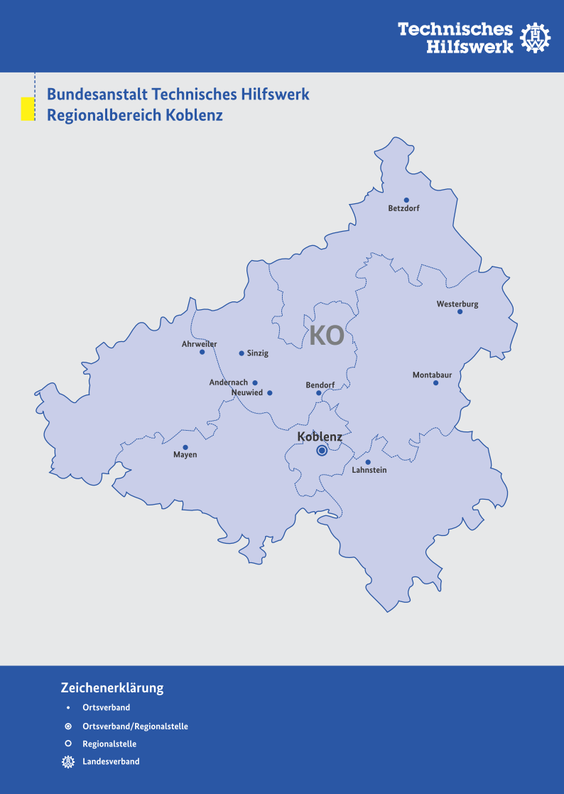 Die Regionalstelle ist die Servicestelle für die Ortsverbände und betreut die 11 Ortsverbände im Bereich Koblenz. Sie koordiniert und verwaltet die Ressourcen in Absprache mit den Ortsbeauftragten und sorgt für die Sicherstellung der Aufgabenerledigung und Einsatzfähigkeit der ihr zugeordneten Ortsverbände. Zudem ist sie der Ansprechpartner für alle Behörden und Stellen oberhalb der kommunalen Ebene.