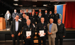 VG Bad Hönningen / Rheinbrohl. Am Freitag, den 16.05.2025 fand im Römersaal in Rheinbrohl der Abend der Feuerwehren der Verbandsgemeinde Bad Hönningen statt. Bürgermeister Jan Ermtraud und Wehrleiter Michael Scharrenbach konnten neben den aktiven Mitgliedern der Feuerwehr, Jugendfeuerwehr und Alterswehr, Landrat Achim Hallerbach, den Brand- und Katastrophenschutzinspekteur Holger Kurz, sowie weitere Vertreter/innen aus Politik und der kommunalen Familie begrüßen. Auch die Werkfeuerwehr Kandelium nahm am Abend der Feuerwehren teil